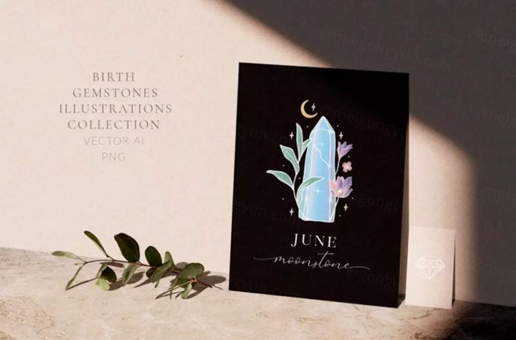 手绘水彩风格的宝石钻石矢量插画集合-AI,PNG,手绘诞生石宝石插图收藏,治疗晶体的设置:白色的选项。与月亮和星的色的开花的宝石。占星术集。