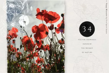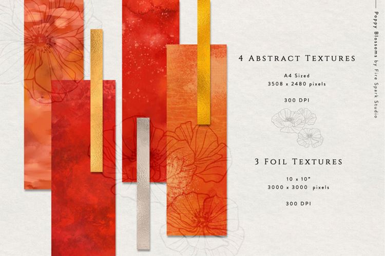 精致而漂亮的罂粟花包括34朵带插图的罂粟花,您可以将其与7种纹理叠加在一起,以创造出美丽而独特的构图。用它们来增强你的品牌、标志设计、婚礼请柬、纺织品图案等等。
