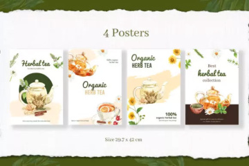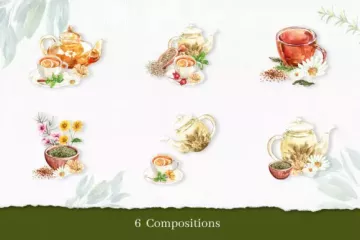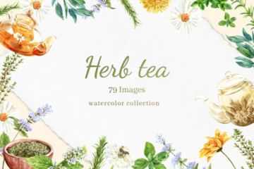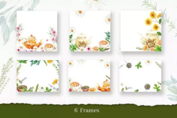 含花草保健茶时间的水彩插画套装,包含许多元素(海报、图案、画框、单个元素)文件;为了获得最佳质量,所有元素均为高分辨率300 DPI,所有PNG文件均具有透明背景。