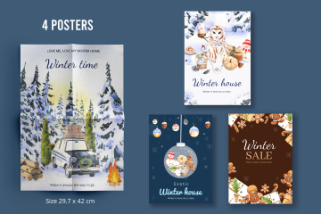 – 4张海报(PNG,PSD):大尺寸;2 MB以上; PSD 23至100 MB