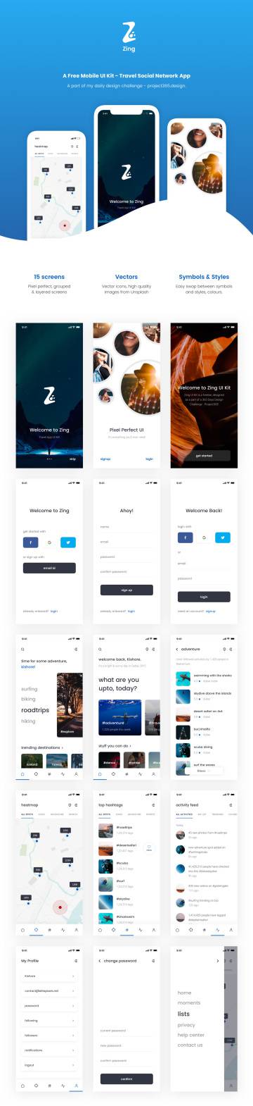图穷联素材库 » 基于旅行的社交网络APP iOS移动UI工具包 Zing iOS UI Kit