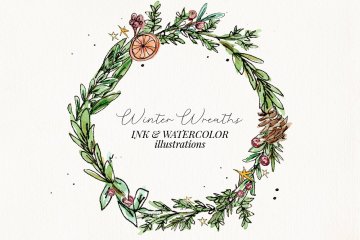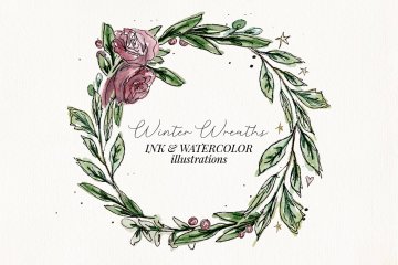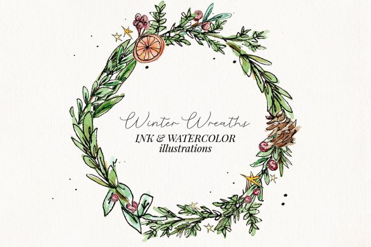 图穷联素材库 » 水彩手绘冬季花卉植物花环圣诞婚礼装饰元素 Ink Wate