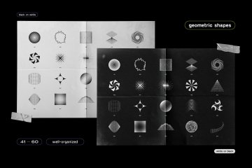 240个PNG文件– 100个几何形状(5000×5000 px)+ 20条分隔线(10000×1000 px),黑色和白色,透明背景。