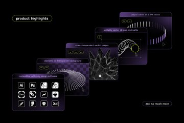 120个SVG文件–透明背景上的可编辑矢量元素。这些文件可以导入到支持SVG格式的任何矢量编辑器中,例如Canva,Sketch和Figma。SVG文件也可以在Blender等3D软件中使用。