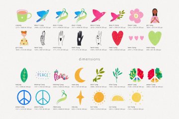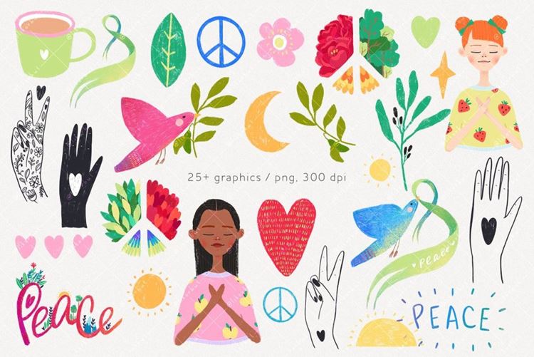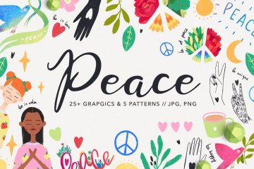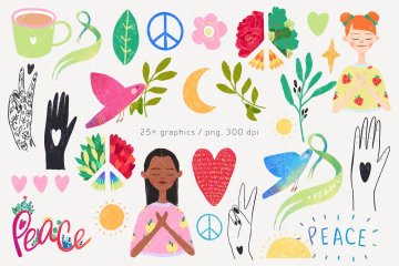 很高兴介绍《世界和平与爱》的图形和图案。超过25种图形和5种模式供您出色的项目使用。将它们用于文具,徽标,品牌,邀请,卡片,海报,印刷品,心情板,Instagram帖子等。