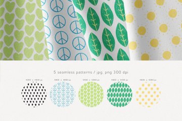 5种无缝图案PNG和JPG,300 dpi(透明和白色背景)