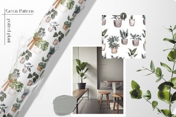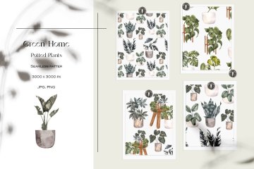 水彩手绘龟背竹盆栽植物无缝拼接图案 Potted Plant