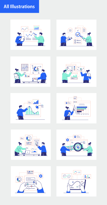 BLAU-业务分析和数据统计插图–包含10个Web和移动设计插图,可帮助您创建漂亮的设计。所有插图都是100%可定制的,并使用矢量形状创建。您可以更改颜色和大小以符合您的要求。