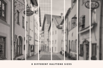 凸版半色调技术是您将要使用的这个包。使用8个可用的半色调压选项自定义点的大小,以添加或减少细节。如果您需要使图片具有某种突出的阴影,请使用随机提供的颜色叠加层。最好一次尝试,而不是两次听到!处理照片项目(如广告,品牌元素或海报设计)时,效果非常容易处理。
