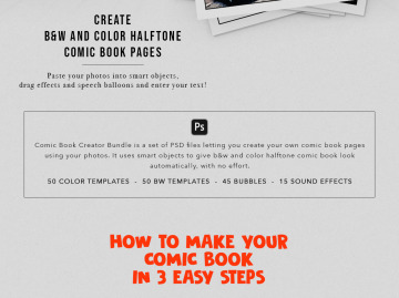 漫画创作者是您使用自己的照片创建漫画页面所需要的一切。只需在Photoshop中打开100个模板文件之一,选择所需的框架布局,然后将所需的照片粘贴到Smart Object中,就可以进行魔术了!然后将气泡拖到您的漫画中,无论您希望将其放置在何处并编写自己的文本。