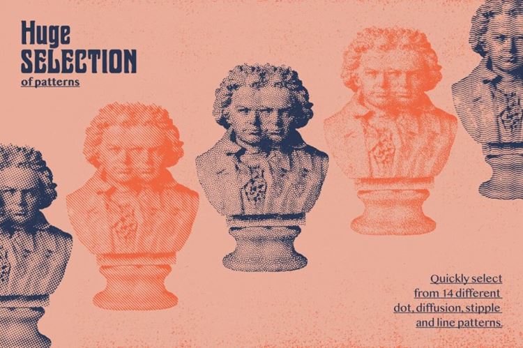 14个独特的半色调网点,线,噪声,扩散和点画图案。