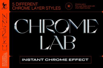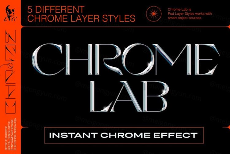 铬实验室!该产品可在几秒钟内将您的图形变成镀铬外观。Chrome Lab由5种不同的Chrome样式组成。它们是专为新设计时代而创建的。镀铬风格是复古主义未来设计概念中必不可少的元素。所有5种效果都非常适合在您的设计中添加chrome元素。