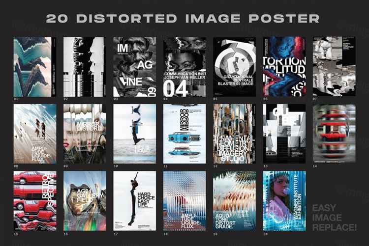 0张扭曲的图像海报。它们都可以作为智能图层进行编辑。只需替换您的图像并观看受海报艺术风格影响的图像即可。您还可以编辑文本和排版。在海报中使用您自己的图像是一个完美的产品。您可以通过使用任何类型的图像来创建吸引眼球的视觉效果。产品也可用于在任何其他设计材料中使用图像扭曲效果。