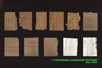 我很高兴介绍我的 Distressed Cardboard Texture 套装。它由 11 种不同的纸板纹理组成。这些纹理以 600 DPI 扫描并在 Photoshop 中微调以获得最佳效果。图形来自做旧和磨损的纸板。有些切口是手工制作的,但总的来说,我尽力保持边缘粗糙,并按照我发现它们的方式撕裂。它们非常适合任何需要仿旧纸板外观的项目。