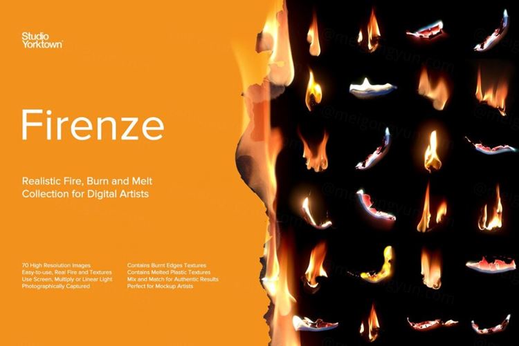 Firenze 是数字艺术家的 60 多种逼真的火焰、火花、熔化和燃烧效果图形资产的集合。