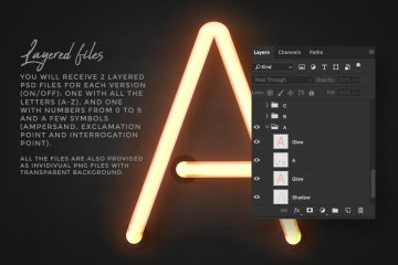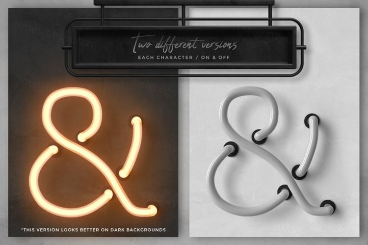 您将需要 Photoshop 才能使用 PSD 文件。PNG 文件可在支持该格式的任何软件中使用。PSD 文件是分层的(例如,字母的阴影位于单独的图层上,或创建为可编辑的阴影层效果(支架、电缆)。PNG 文件是 PSD 的扁平版本,但仍然可以编辑为在某种程度上(例如,修改霓虹灯的颜色)。它们作为具有透明背景的单独文件提供。