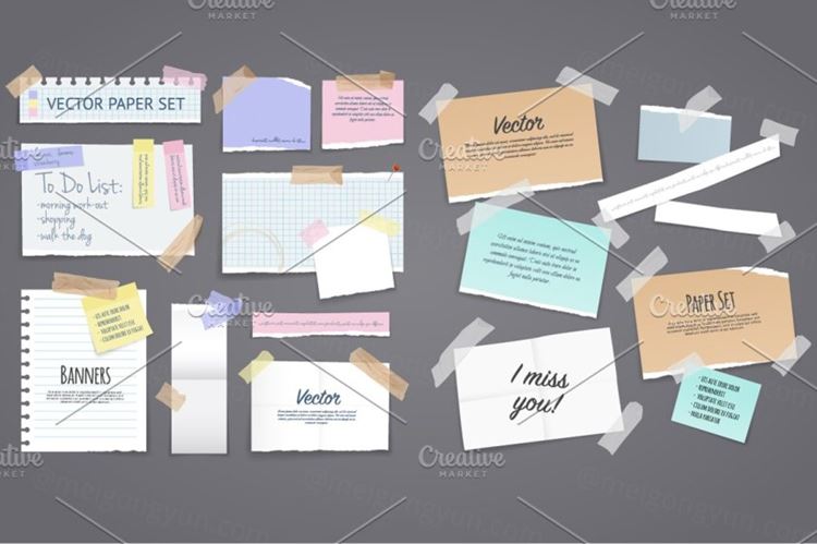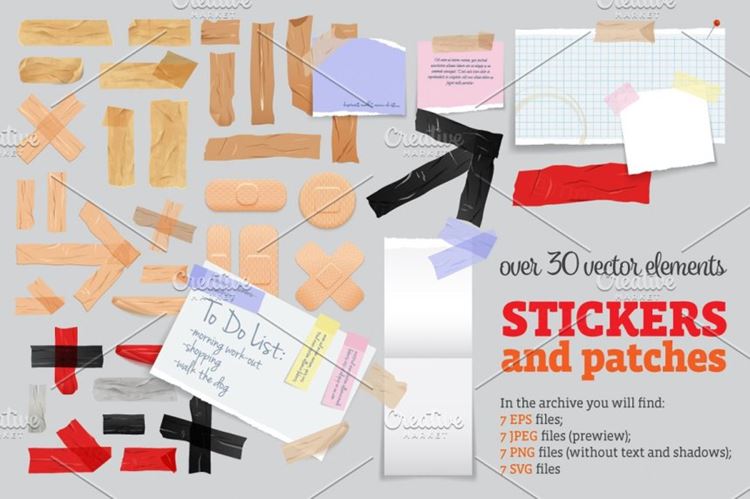 大粘性套装,包括膏药、胶布绷带、便签纸、胶带和胶带。所有元素都以 JPG、EPS、PNG 和 SVG 格式提供。