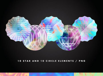 所有这些图形对象都是在 Photoshop 中设计的,并从头开始制作,以获得干净时尚的全息效果。10 个星星和 10 个圆圈元素集合中的每个贴纸都可以用作附加细节,使整个构图效果更佳十倍!用于背景透明度的原始轮廓和 PNG 格式促进了工作流程,因此您可以更专注于所需的效果。