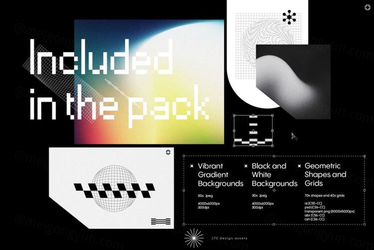 Texturas包含 30 个充满活力的复古渐变、30 个黑白背景、70 个抽象的简约形状和 40 个扭曲的网格。非常适合快速、引人注目的设计。所有资产都可以很好地协同工作,也可以单独工作。