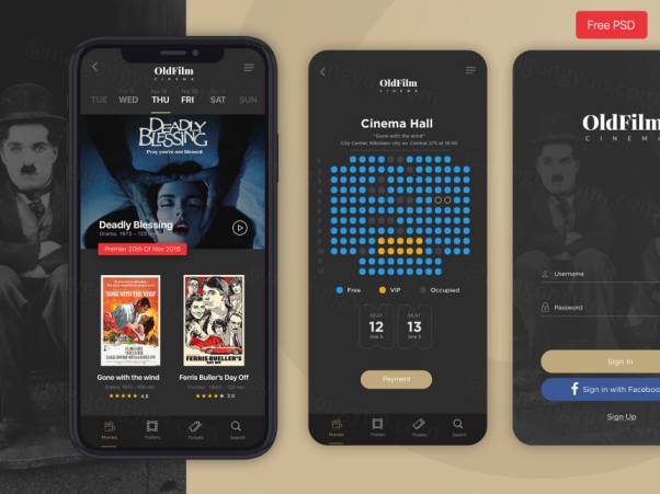 图穷联素材库 » 电影票预订移动APP黑金风格UI界面设计工具包 OldFilm | Cinema