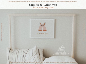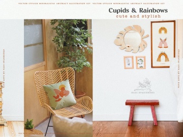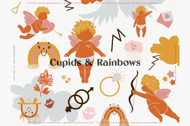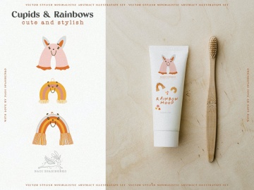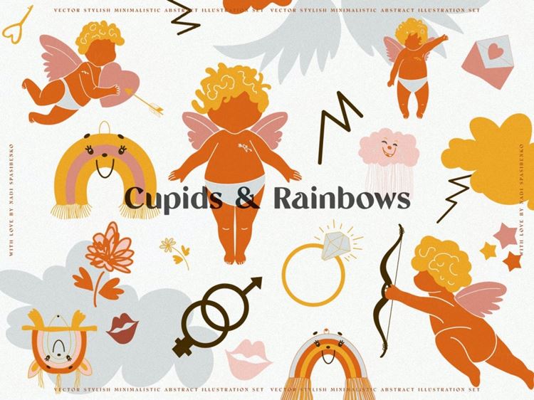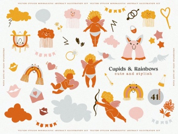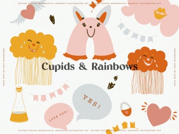 可爱的彩虹和丘比特 时尚的抽象简约儿童插图集。此套装适用于面料、墙纸、明信片、纸张、童装、海报、网站、社交网络和许多其他商品。