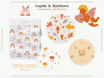 41个元素:彩虹、云彩、欢快的雨云、心形、丘比特、箭头、翅膀、滑稽可爱的彩虹、亲吻和鲜花。PNG 和 AI 格式(矢量) 该集还包括 4 种适合您业务的无缝模式。