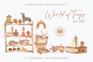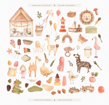 80 幅插图:玩具、玩具屋、木制玩具、玩具组合、火烈鸟、斑马、羊驼、女王娃娃、狮子头、章鱼、水母、灯塔、拖拉机、蝴蝶、木风、气球、手提箱、木制蔬菜等等。您只需欣赏预览并亲眼看到一切。