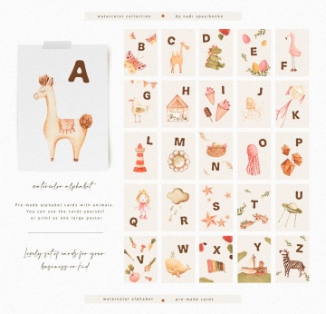 玩具世界 - 这是一套非常棒的玩具,具有波西米亚风格、木质和柔软、非洲动物等等。该套装非常适合您的婴儿品牌、剪贴簿、纸张、床上用品、学习卡、杂志、博客等。该软件包还包括英文字母。总共有26张预制卡片,您可以将它们用作主要设计,也可以将它们打印作为客户的奖励。