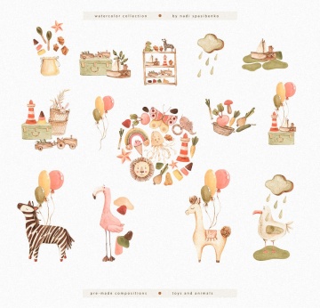 图穷联素材库 » 波西米亚水彩动物玩具儿童婴儿房间绘本装饰剪贴画合辑 Wate