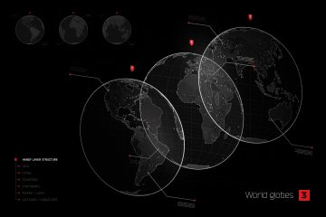 3 个世界地球仪——详细的地球地球仪,包括大陆和海洋、国家和城市、河流和湖泊、纬度和经度,每个都在一个单独的图层上。