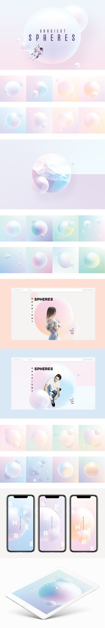 24 个彩色全息渐变球体和背景的集合!这些将在网页和应用程序设计中创造奇迹,它们与排版和照片结合使用效果很好。由于它们柔和的调色板,它们不会压倒设计,而是强调重要的东西,同时通过一点点现代感来展现趣味性。