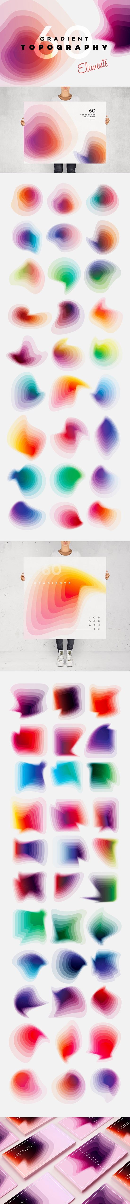 我很高兴向您展示 60 个地形渐变!这个巨大的集合将是网络和印刷目的的理想选择。这些抽象的地形形状非常适合作为照片的背景、网页元素、海报或小册子设计等等。请查看屏幕截图以获取灵感并查看产品中包含的所有渐变!