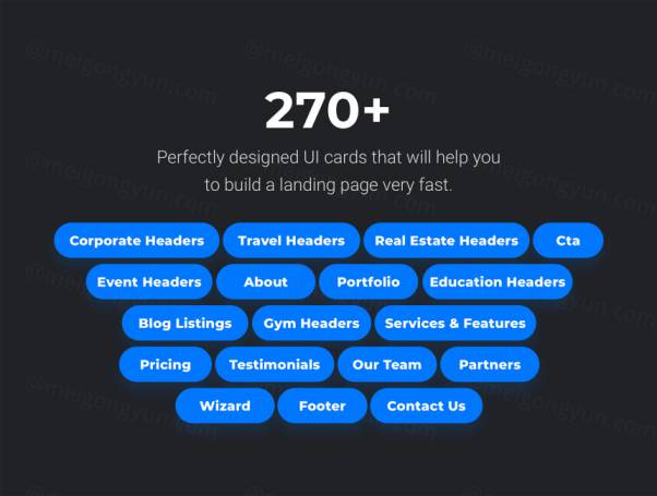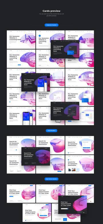 这个UI卡包非常适合您的创业公司。您将能够轻松地为本地商业,企业页面,活动,派对,健身房,旅游,预订,公寓,房地产,教育,大学,创意和其他业务领域创建登陆页面。
