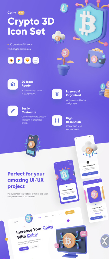 Coiny 是一组适用于任何加密货币产品的自定义 3D 图标。使用 3D 图标让您的下一个产品和项目更加精彩。