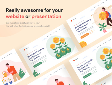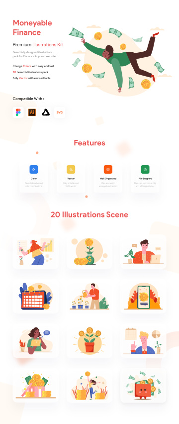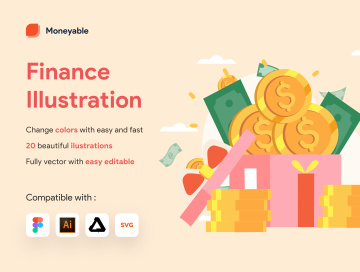 Moneyable 是我们的第一个插图产品之一。此插图集包括 20 幅插图并兼容:AI(Adobe Illustrator)、Figma、SVG 和 Affinity Designer。