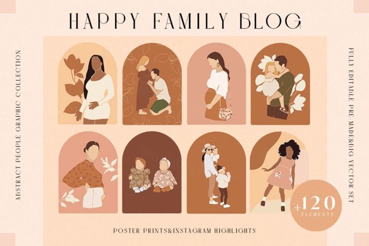 Abstract Family Mother Baby Kid 博客- 它是 Instagram 预制故事、精彩集锦、可印刷海报、剪贴画和矢量可编辑文件的大集合。您可以为您的创意、项目、社交媒体和邀请混合元素、更改大小或使用具有独立背景的 png。使用时尚的矢量插图创建您的业务,为您的想法添加独特的触感。