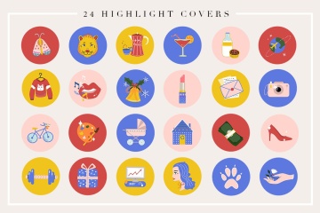24 卡通高光图标集- 手绘卡通数字图标集合,包含 24 个人艺术。这套包括鸡尾酒、咖啡、口红、自行车、毛衣、房子、女孩、嘴唇、油漆、哑铃、狮子、婴儿车、铃铛、金钱、鞋子、信件、相机、旅行、计算机、爪子、蝴蝶等的图标。不同的主题,卡通明亮的图标,它将装饰您的 Instagram 帐户。