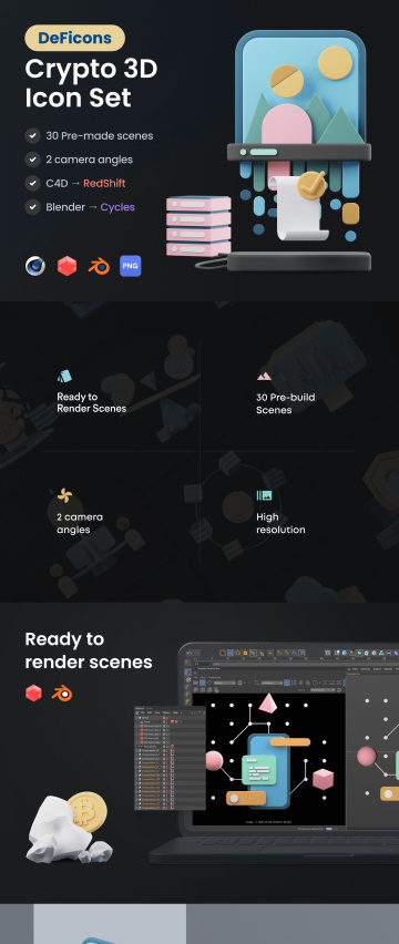 向 DeFicons 打个招呼 - 3D Icon 一组美观的加密场景,可完全自定义并准备在 C4D(使用 RedShift)或 Blender(Cycles)中渲染。