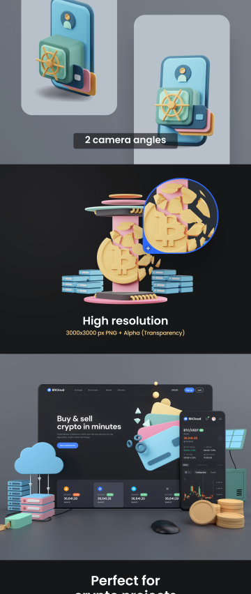 高质量三维渲染加密货币区块链比特币场景插画素材合辑 DeFi