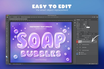 肥皂泡文字和标志效果 肥皂泡在短短几秒钟内的逼真效果。来自您的文本、徽标、形状的魔法气泡 – 适用于任何事物!易于使用的 Photoshop 样机。只需编辑智能对象内的文本并保存。