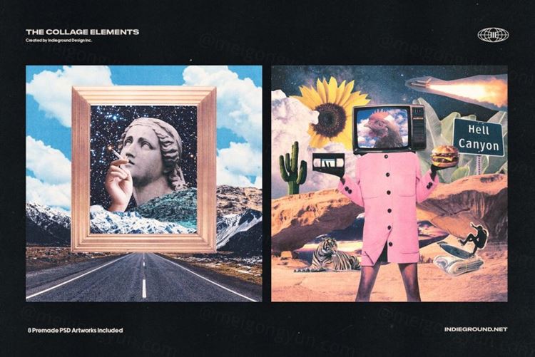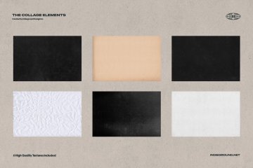 该包还具有 6 种高质量纸张纹理,您可以将其用作艺术品组合或叠加效果的背景,为您的设计演示和美学艺术品赋予复古/复古外观。最后,我们还包括 8 个预制的 PSD 艺术作品来完成这个终极拼贴工具包。