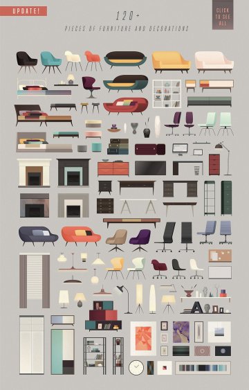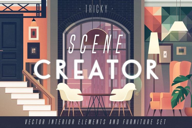 “TRICKY”场景创建器是一组矢量室内元素和家具。为不同的目的创建自己的精彩场景。您可以从头开始制作场景或使用预先制作的插图。希望你会喜欢使用它。