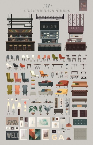 图穷联素材库 » 扁平化咖啡馆餐厅室内家具装饰元素场景制造者插画合集包 TRI