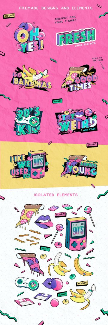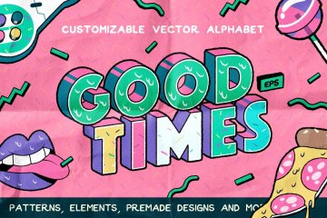 Good Times是一个图形包,包括完全可定制的带数字的矢量字母表、受 90 年代启发的无缝图案、装饰元素、插图对象和酷炫的 T 恤设计。整个包非常容易使用;每个字母或数字都分组并准备好轻松更改颜色。这个包对于制作怀旧的活动海报、时髦的传单、俏皮的邀请函和许多其他很棒的东西可能非常有用。玩得开心。