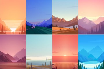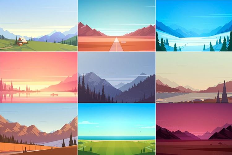 图穷联素材库 » 小清新扁平化自然景观风景户外旅行山水画矢量素材包 Vecto