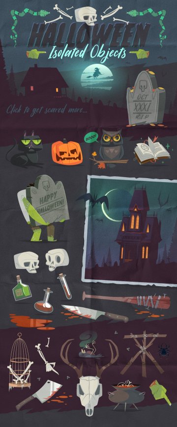 HALLOWEEN VECTOR PACK绝对会帮助您制作许多令人惊叹的东西,例如节日传单、精美的邀请函、海报等,为您的万圣节派对打造真正令人毛骨悚然和有趣的派对!我们确定!它的灵感来自 B 级电影、90 年代卡通和我们童年的其他怀旧事物的混合。