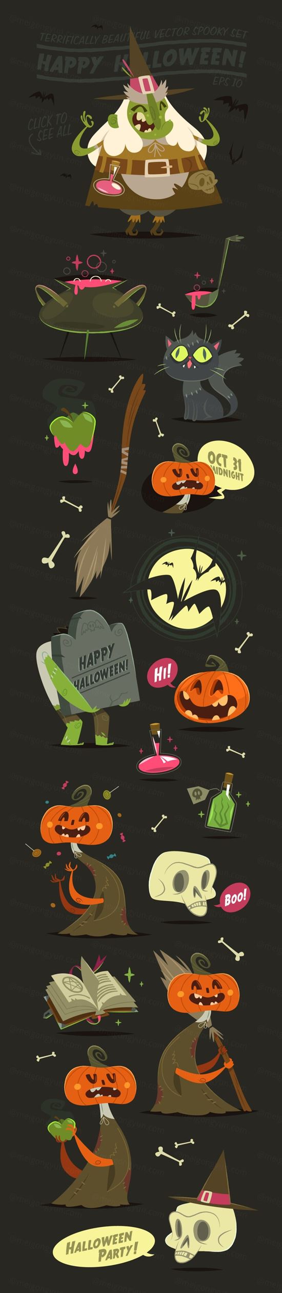 图穷联素材库 » 八九十年代复古万圣节卡通恐怖主题矢量涂鸦插画素材包 Hall