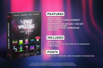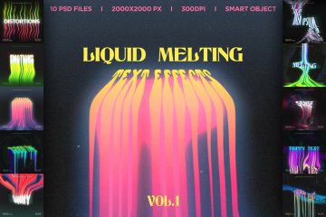 Liquid Melting Text effects Vol.1 这是一组用于 Adobe Photoshop 的 10 种不同的熔化文本效果。您可以将这些效果应用于您的文本。这些效果适用于 T 恤设计、音乐封面艺术、传单、横幅、海报、书籍封面等。