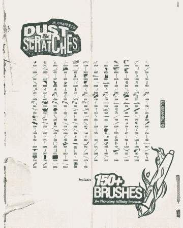垃圾纹理包的最终老板。挤满了适合任何项目的 120 多种尘土飞扬、肮脏、粗糙和损坏的纹理。用作快速叠加或通过蒙版获得创意。还包括额外的 150 多种与 Photoshop、Affinity 和 Procreate 兼容的定制画笔。有关示例用法和 inspo,请参见图库。