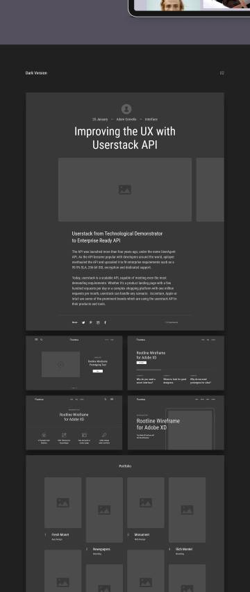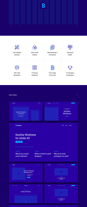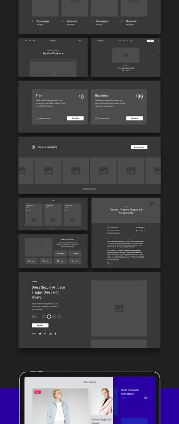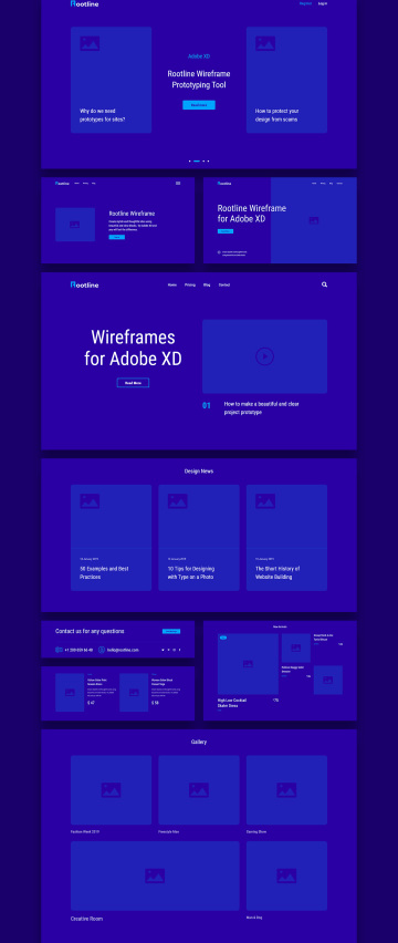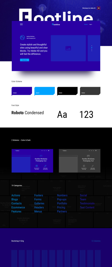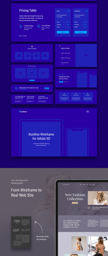 Rootline线框UI工具包 - 为您的项目和原型提供大量现成的时尚模块库。您可以轻松创建时尚的原型,绘制网站并将其显示给客户(客户)。共有19个不同的类别,可以让您创建更多样化和清晰的页面。